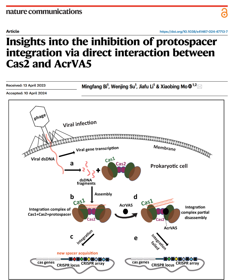 2024年4月10日,该课题组在学术期刊《Nature Communications》上发表,题为“Insights into the inhibition of protospacer integration via direct interaction between Cas2 and AcrVA5”。 该研究在牛痘莫拉氏菌内鉴定了一个可抑制原间隔序列获取的抗CRISPR蛋白(AcrVA5)。