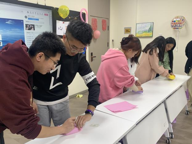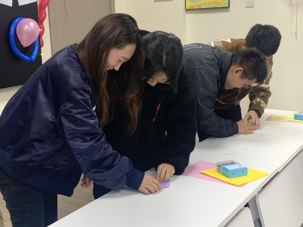 第二个小游戏是捆绑过关,游戏的玩法是其中一人用左手,另一人用右手,合力用桌面的A4纸对枪头盒进行密封包装,包装完好且用时最短的小组获胜。包枪头是我们实验时的必备技能,这个小游戏考验的是同学们彼此之间的默契,也锻炼了大家的动手能力。