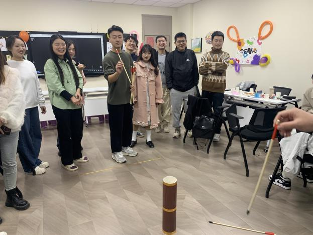 在进行完短暂的热身环节后,活动进入了过渡阶段。此阶段设置了五个趣味游戏,分别是“投壶”、“捆绑过关”、“你画我猜2.0”、“光盘拔河”、“纸杯气球”。